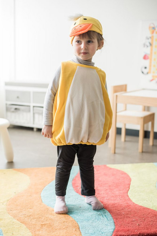 Ce déguisement canard pour enfant de 3/5 ans est constitué d’une blouse sans manche 100% polyester avec pourtour élastiqué. Il dispose de fermeture par lacettes dans le dos et livré avec couvre-chef.