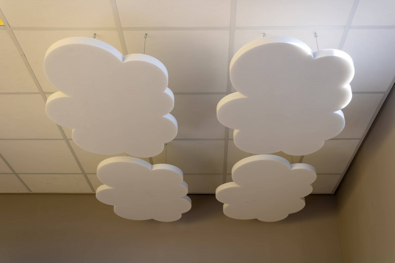 Le nuage acoustique est un dispositif insonorisant à installer dans les salles afin d'avoir un meilleur confort sonore. Il peut être posé sur les murs et les plafonds. Sa forme de nuage ornera la salle de classe ou les autres endroits.